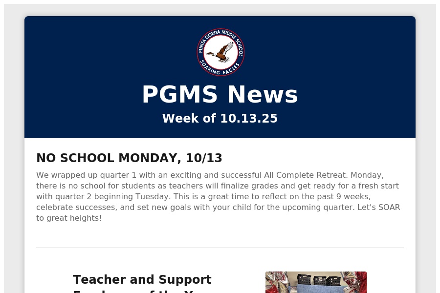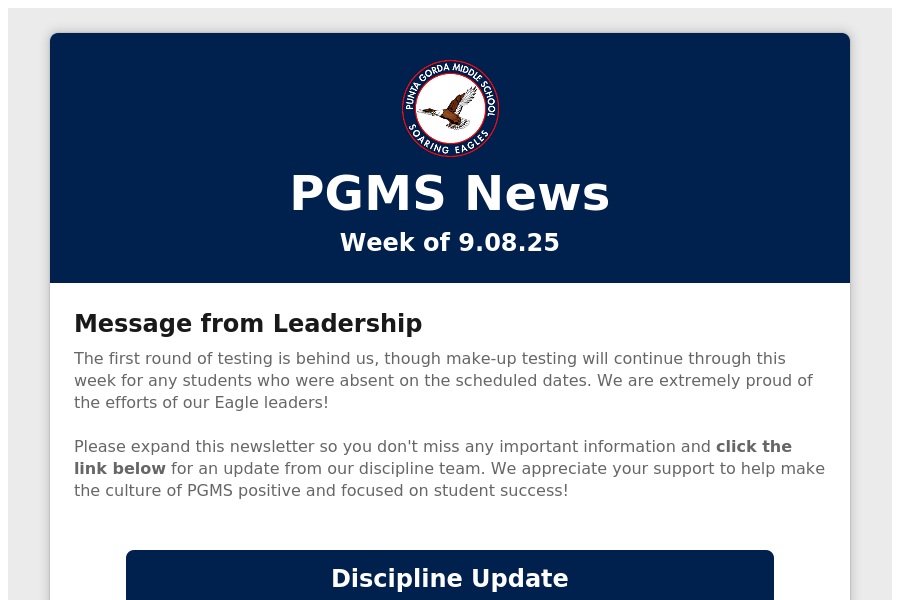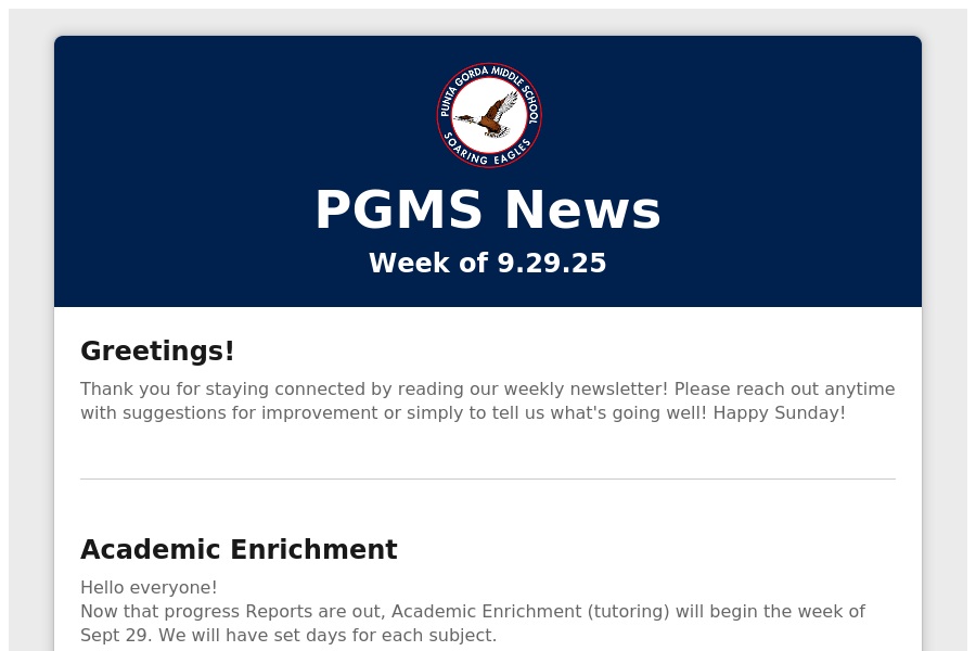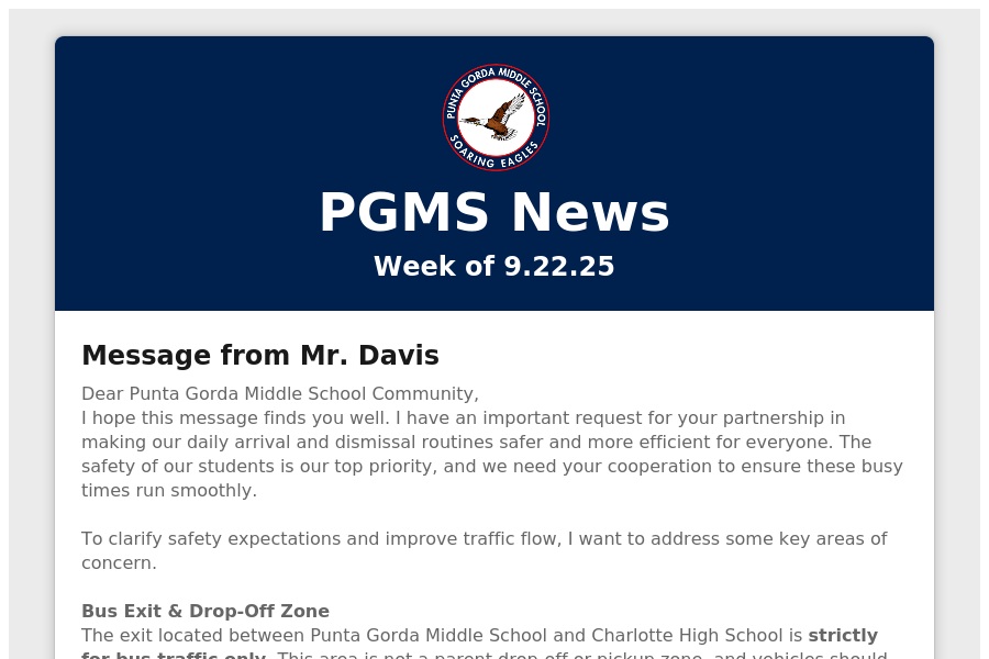 PGMS News Week of 9.22.25 Message from Mr. Davis Dear Punta Gorda Middle School Community, I hope this message finds you well. I have an important request for your partner. . .