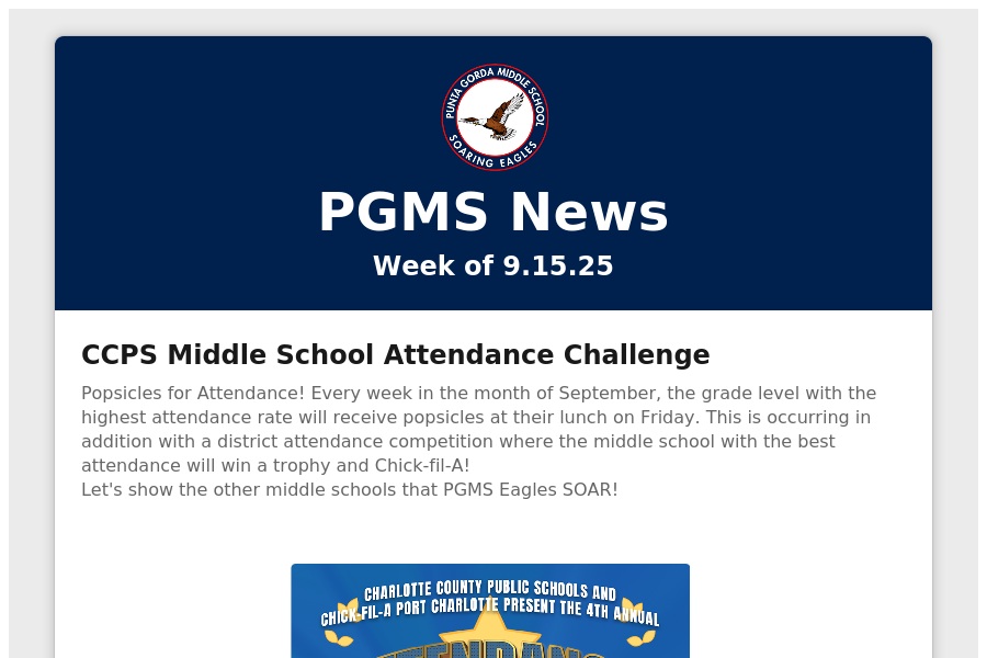 PGMS News Week of 9.15.25 CCPS Middle School Attendance Challenge Popsicles for Attendance! Every week in the month of September, the grade level with the highest attendanc. . .