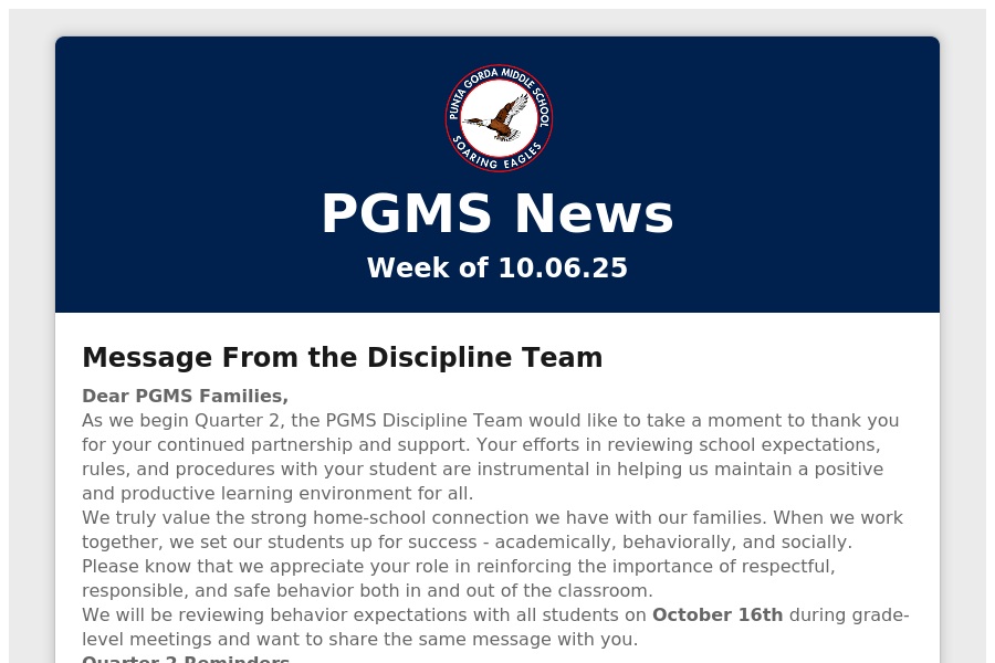 PGMS News Week of 10.06.25 Message From the Discipline Team Dear PGMS Families, As we begin Quarter 2, the PGMS Discipline Team would like to take a moment to thank you . . .