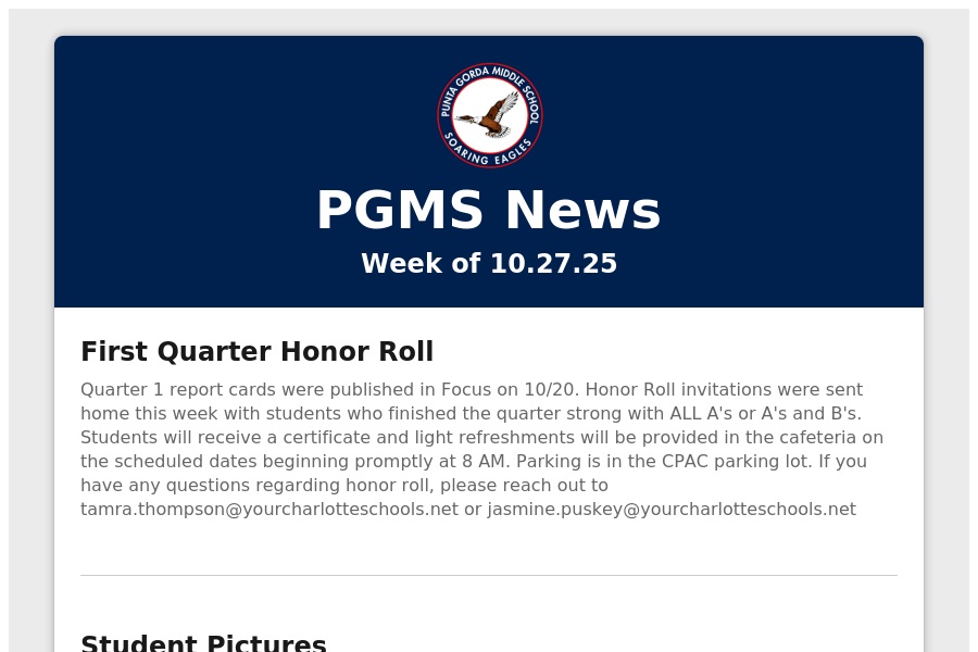 PGMS News Week of 10.27.25 First Quarter Honor Roll Quarter 1 report cards were published in Focus on 10/20. Honor Roll invitations were sent home this week with students w. . .